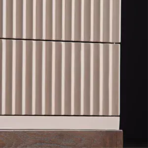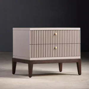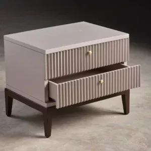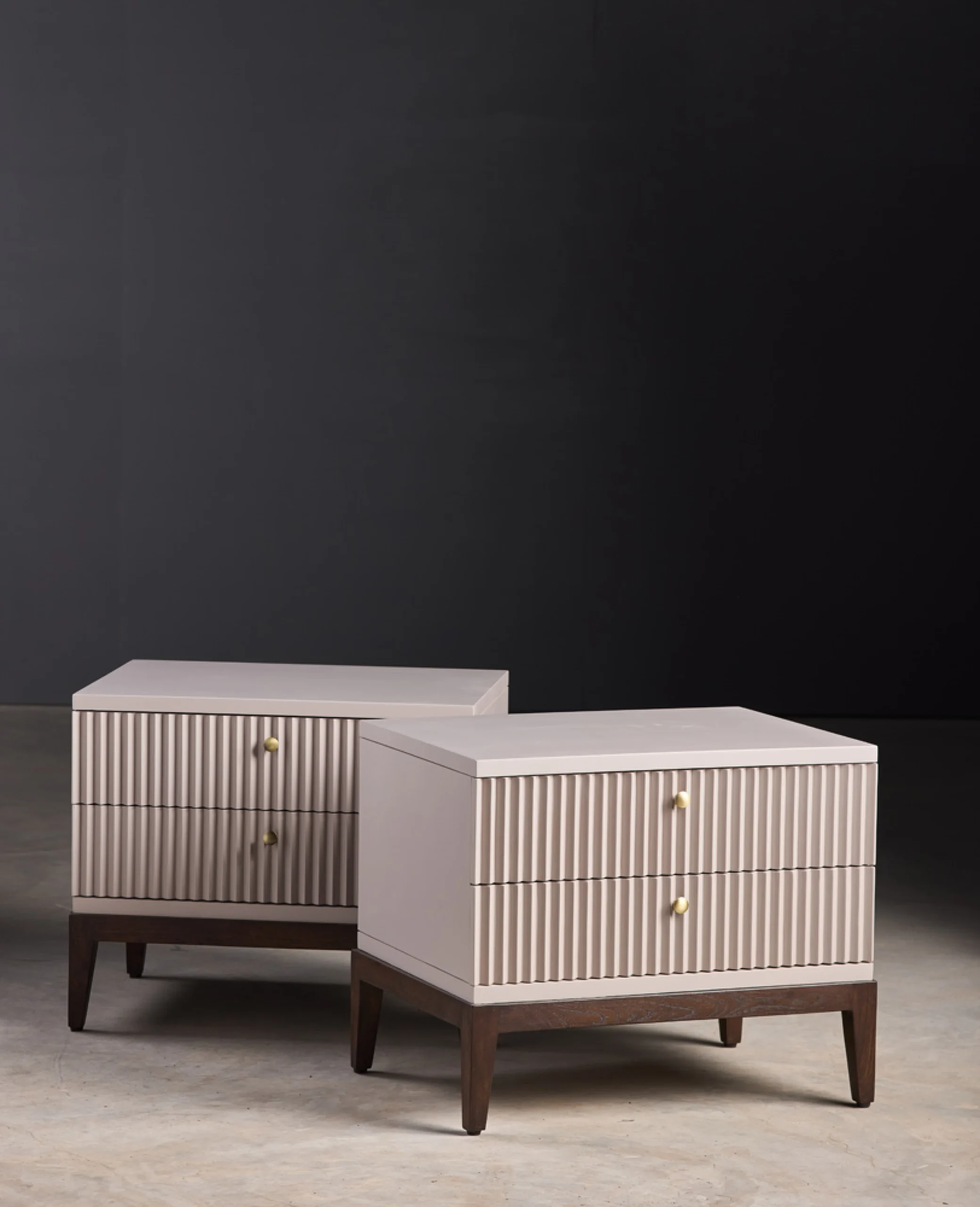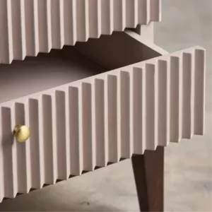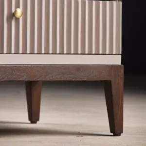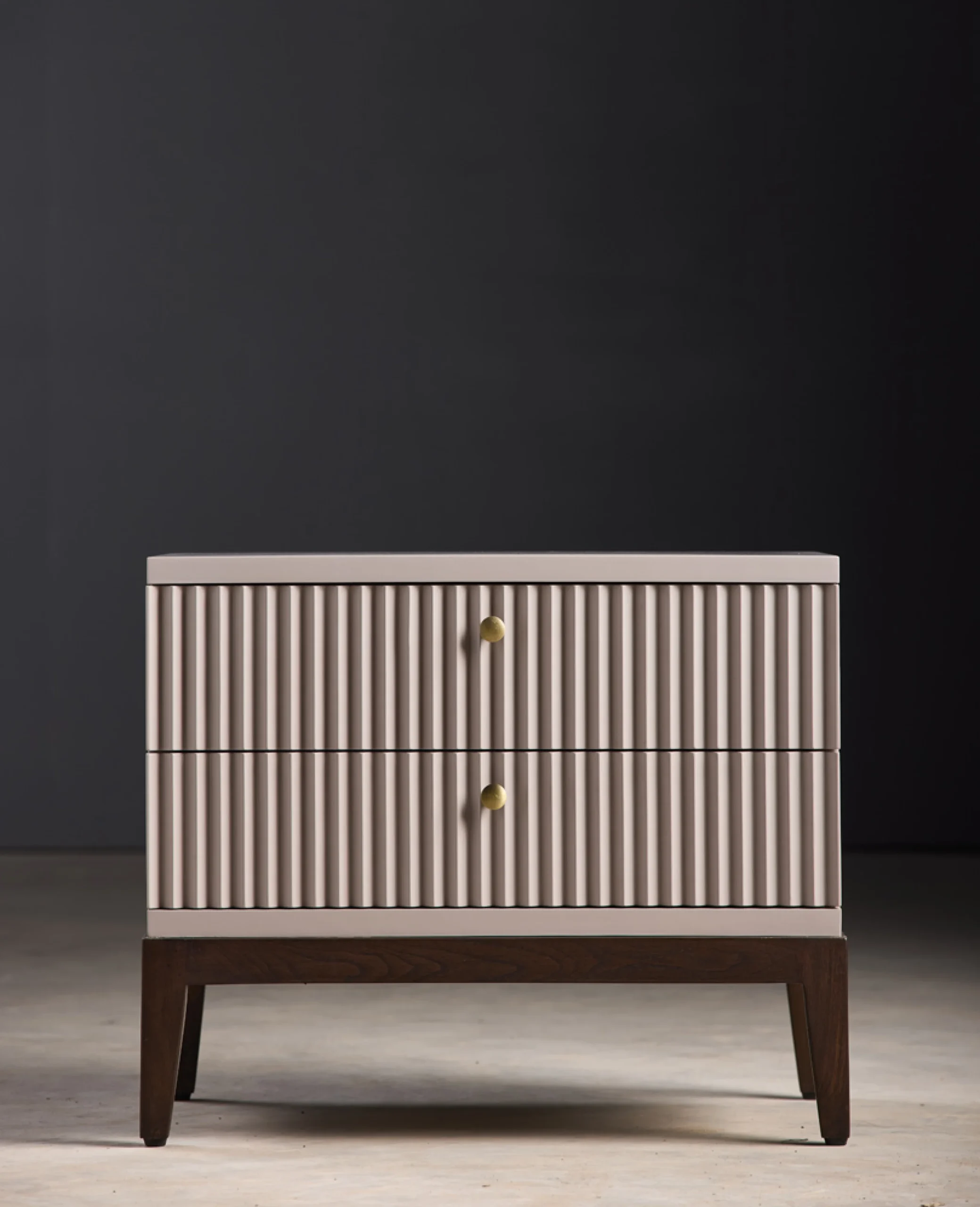A sleek blend of contemporary symmetry and classic warmth, Arden features a ribbed façade for tactile elegance. The dual-drawer storage is accented with brass knobs, merging function with style. Elevated on rich wooden legs, it adds understated sophistication to any bedroom. Perfect for minimalist-luxury interiors
